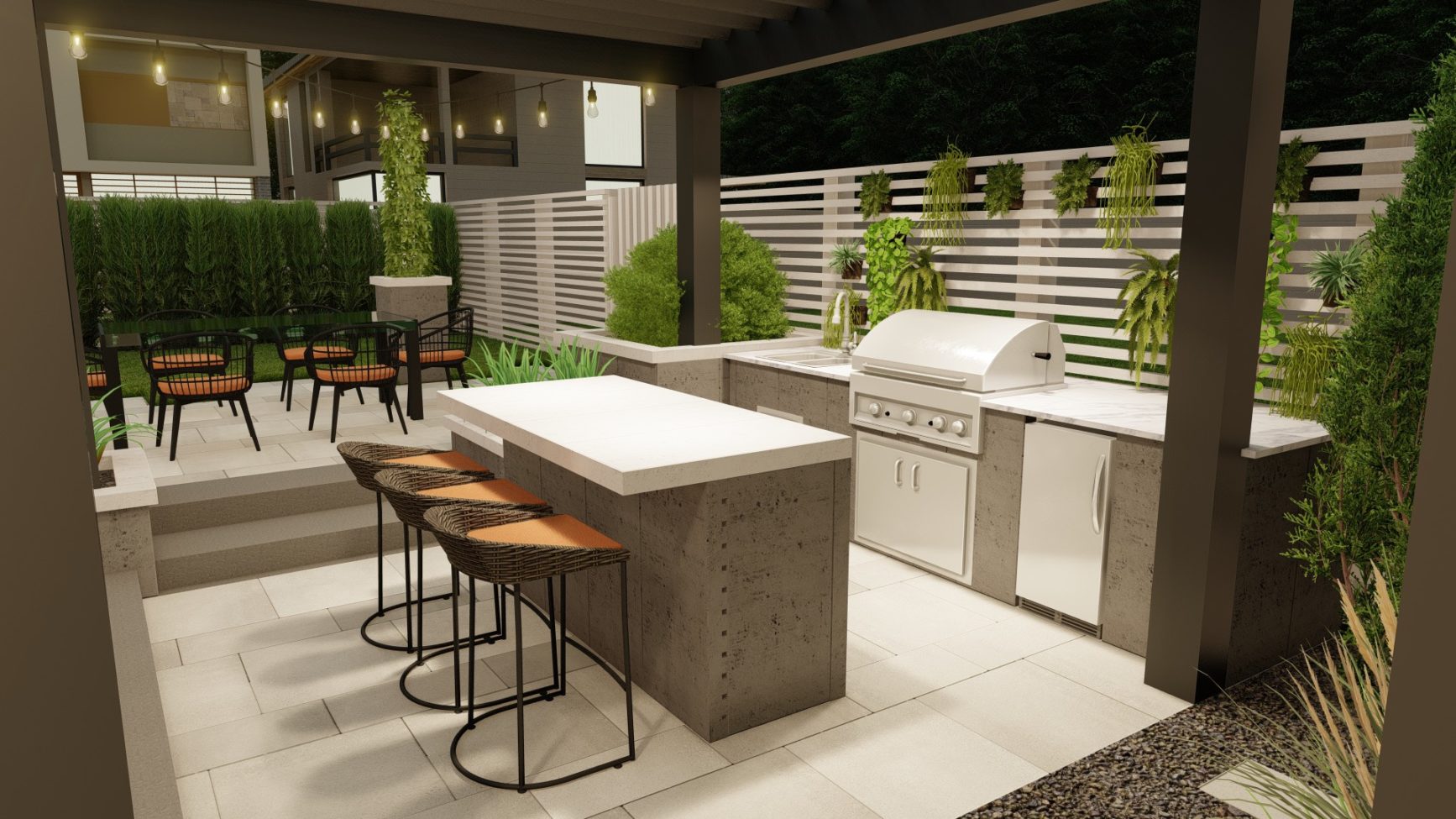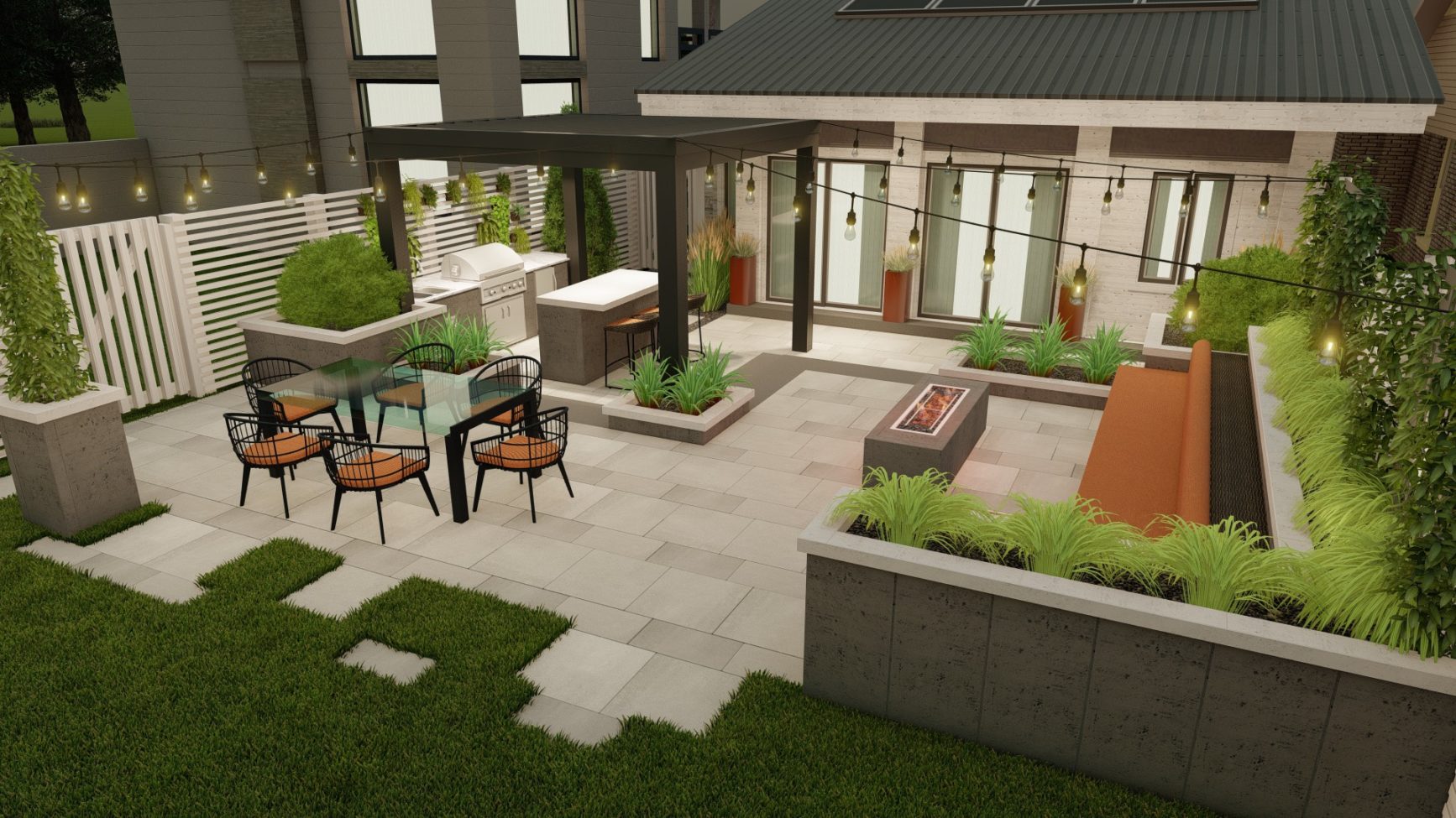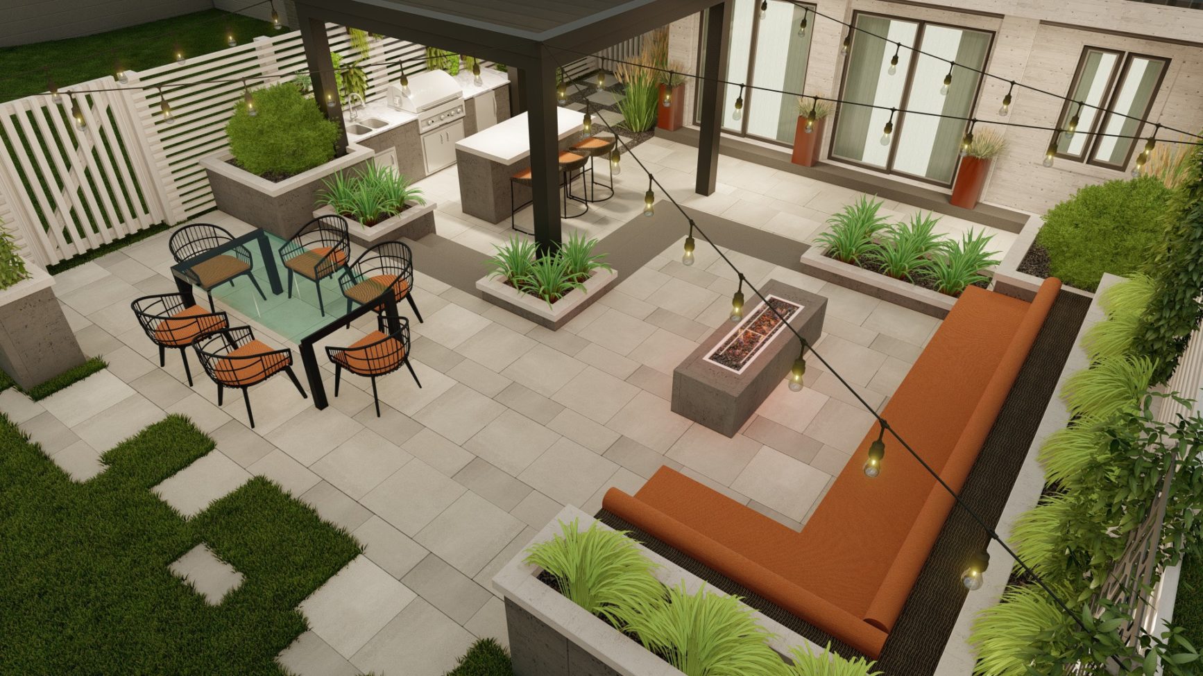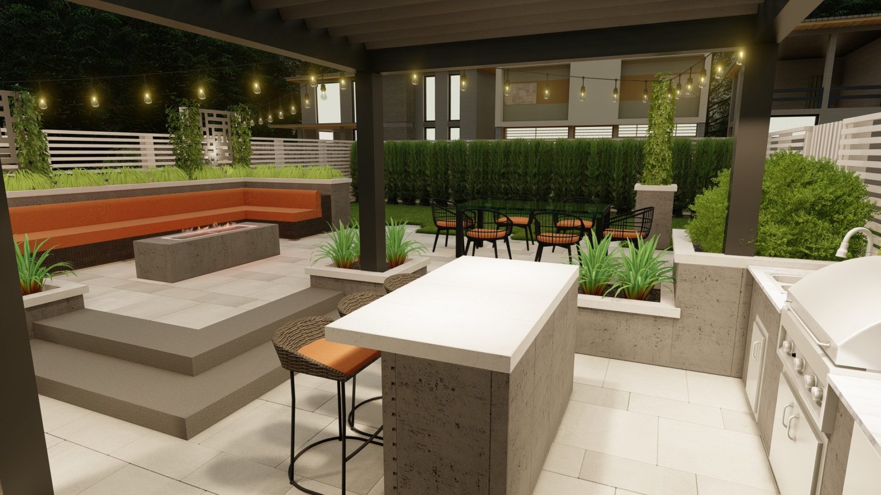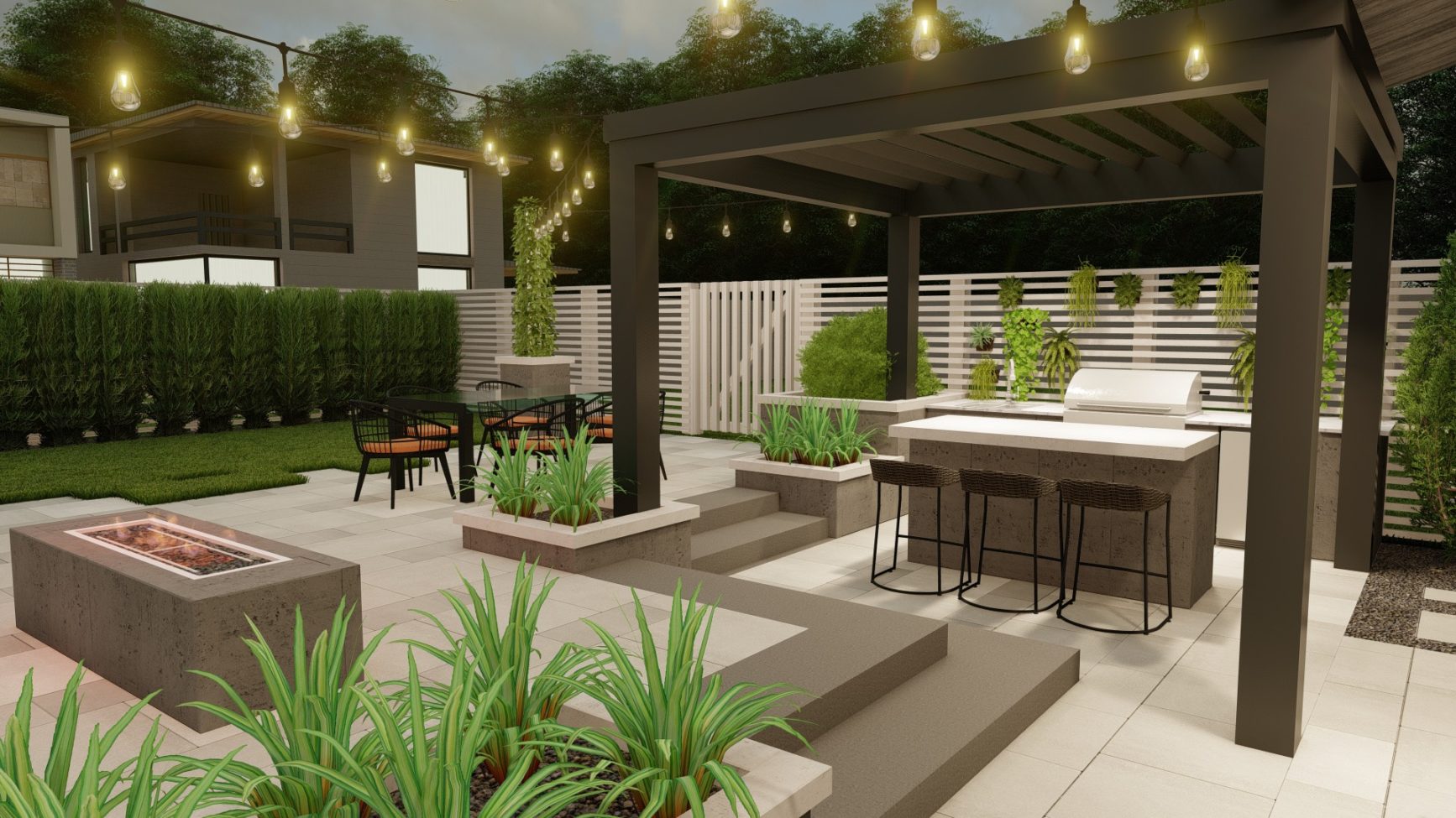 Sophisticated backyard living in the form of a flowing, open design with three distinct entertainment zones. Its monochromatic tones, crisp lines and subtle geometric patterns intertwine with landscaping to create a warm, welcoming atmosphere.