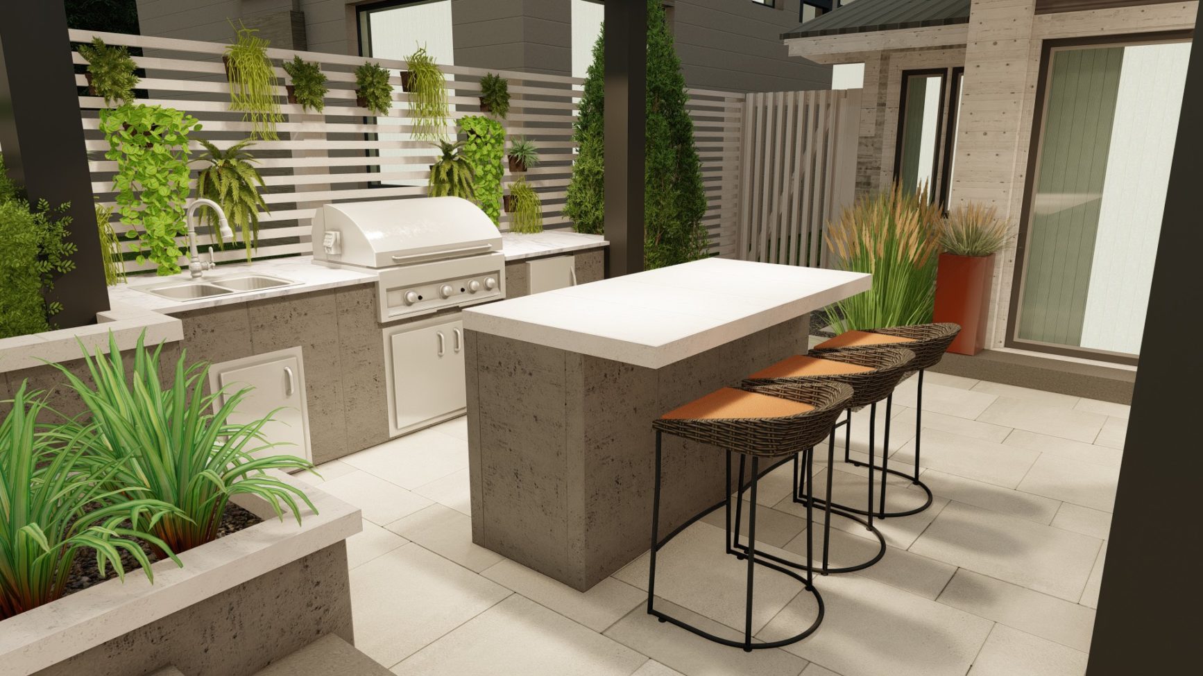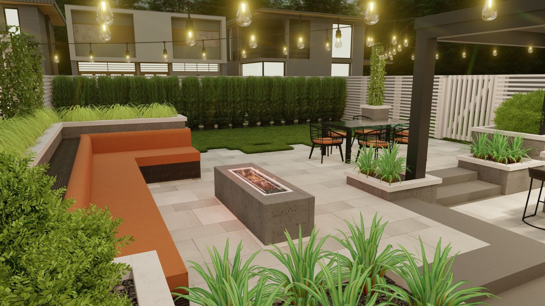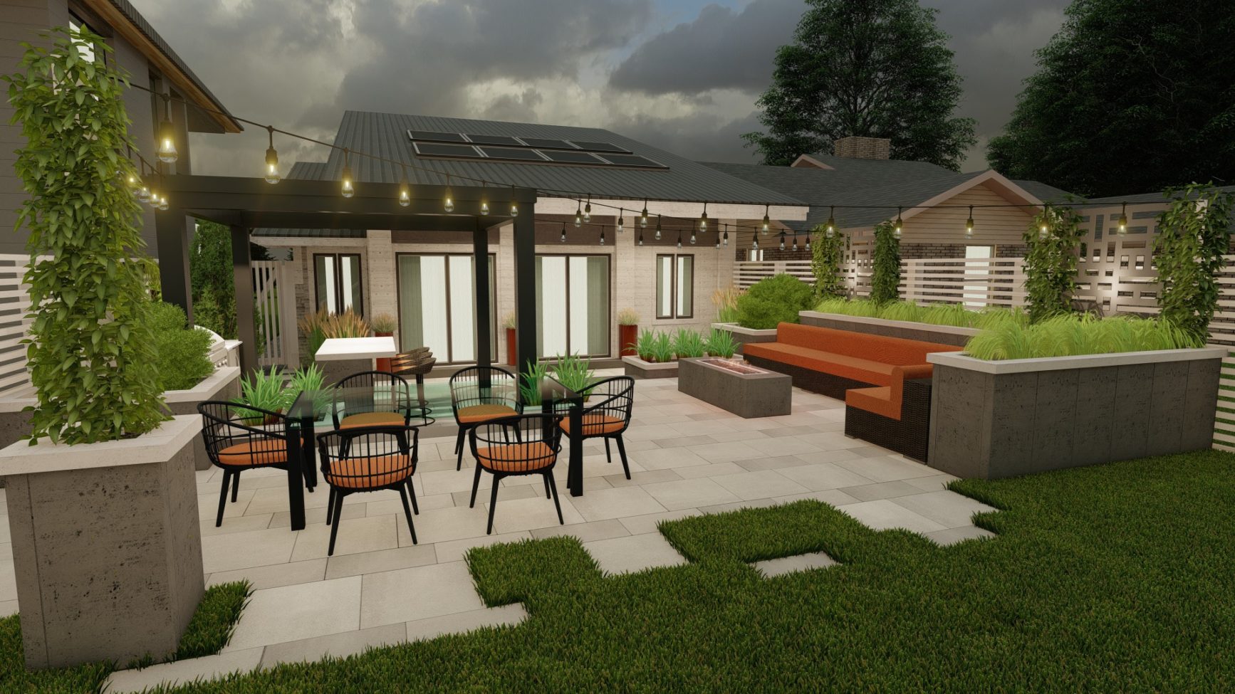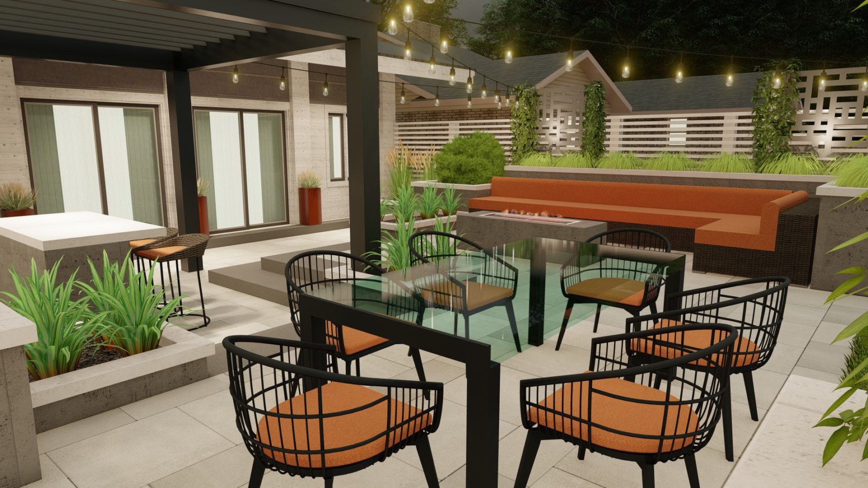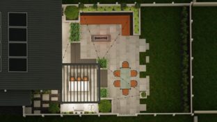 Sophisticated backyard living in the form of a flowing, open design with three distinct entertainment zones. Its monochromatic tones, crisp lines and subtle geometric patterns intertwine with landscaping to create a warm, welcoming atmosphere.